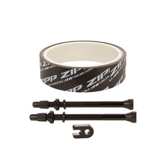 El kit Tubeless de Zipp incluye cinta de 26 mm, 2 válvulas universales de 80 mm y 1 llave para núcleo de válvula. Compatible con 454 y 404. Kits sin cámara para llantas Zipp.